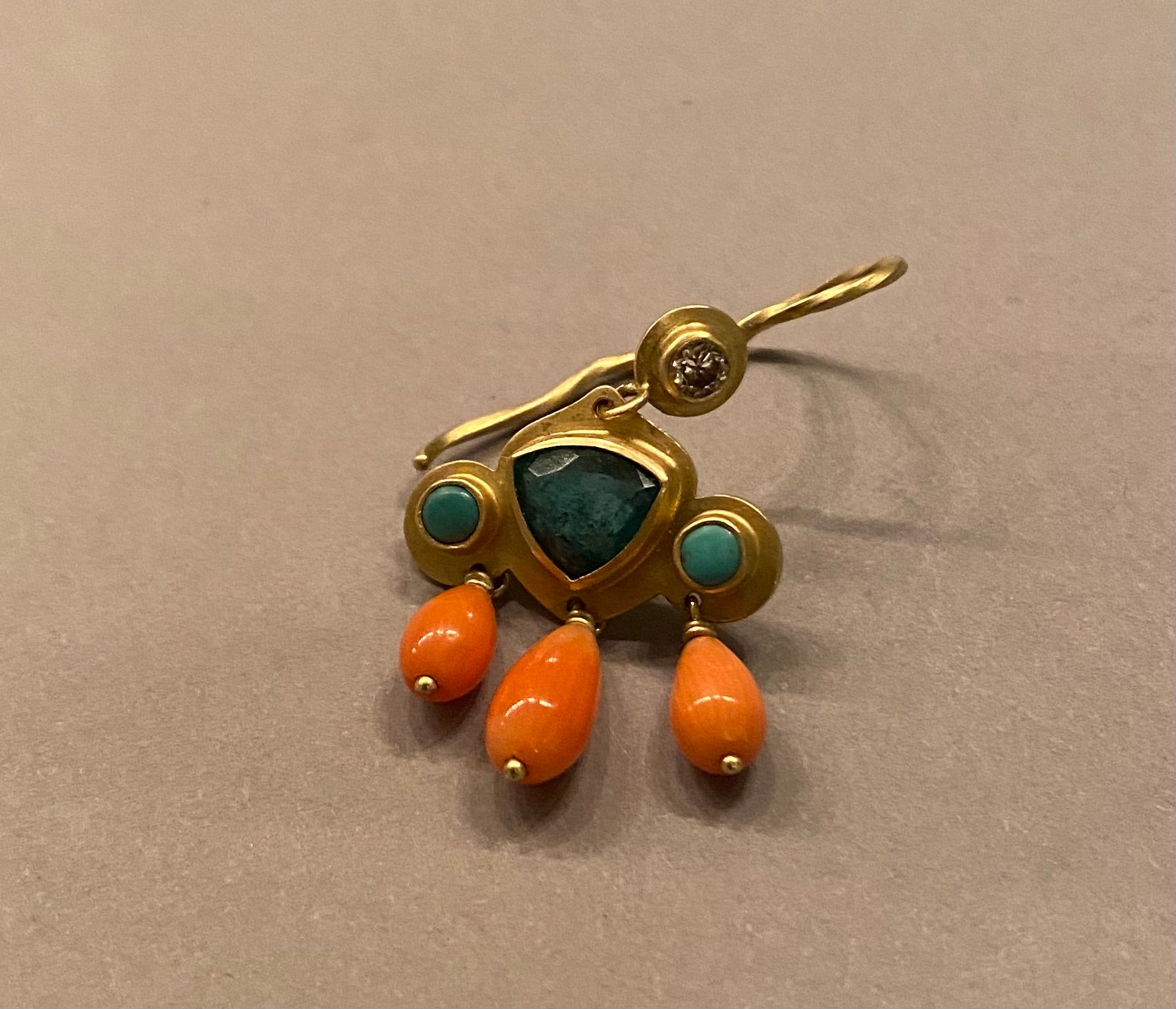 Unique single earring in 18k gold with emerald, coral, turquoise and diamond.
