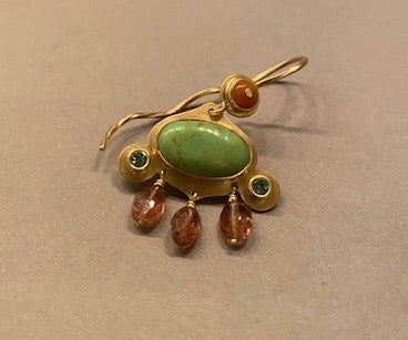 Unique 18k gold earring with coral, turquoise, pink sapphire and tourmaline drops.