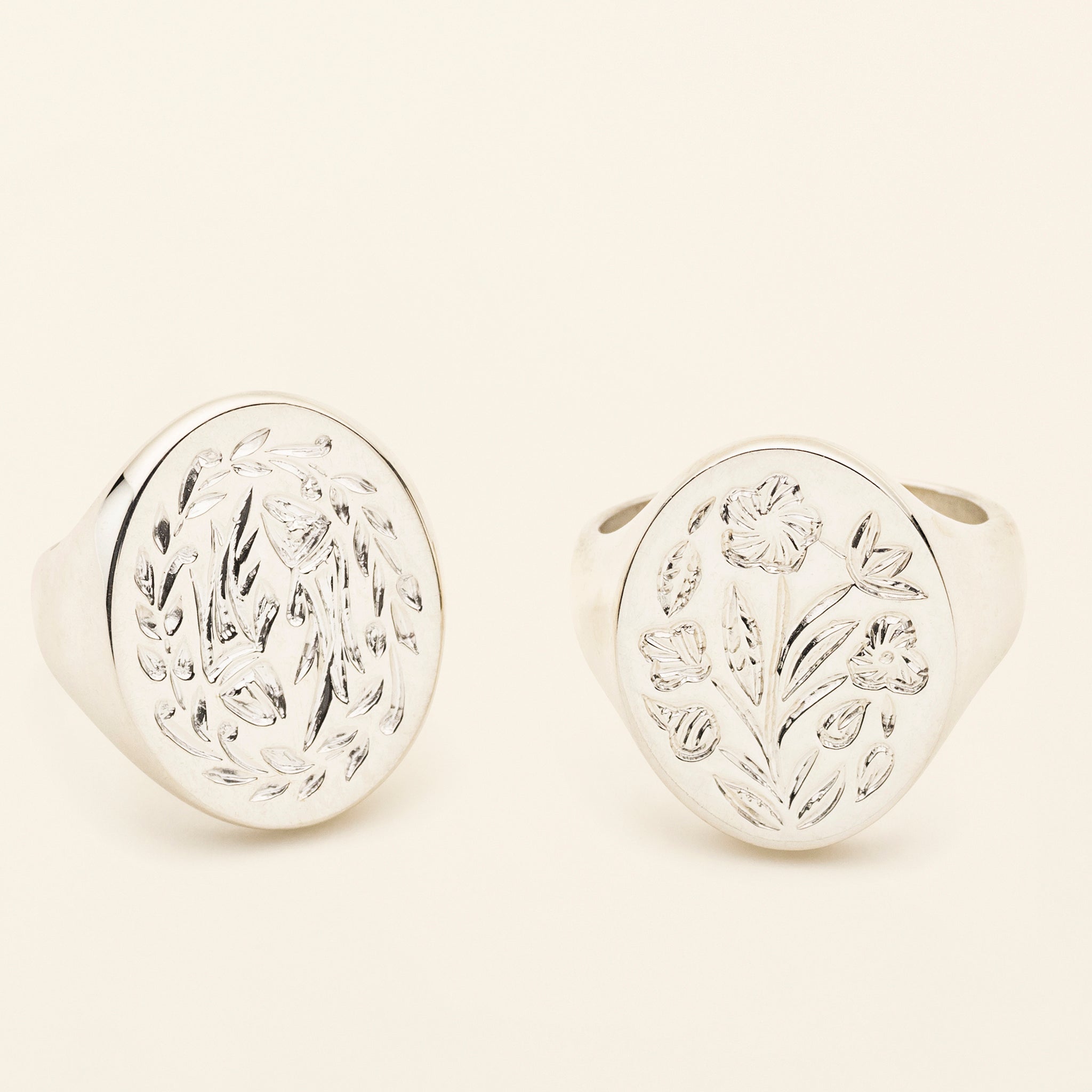 Oval signet ring with engraving in silver with fish or flower. The front of the ring measures: 2cm x 1.5cm. Delivery time 5-6 weeks.